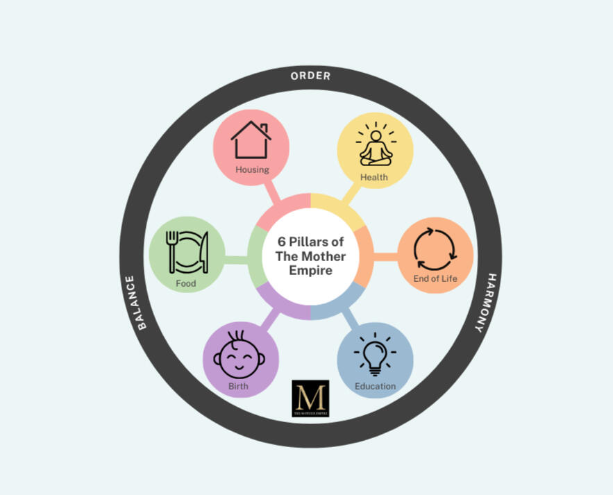 The Mother Empire focuses on the essential systems that shape daily life. Strengthening these areas allows communities to become more resilient, self-sustaining, and aligned with natural human needs.